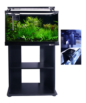 - Matching black stand provides ample storage for aquarium accessories